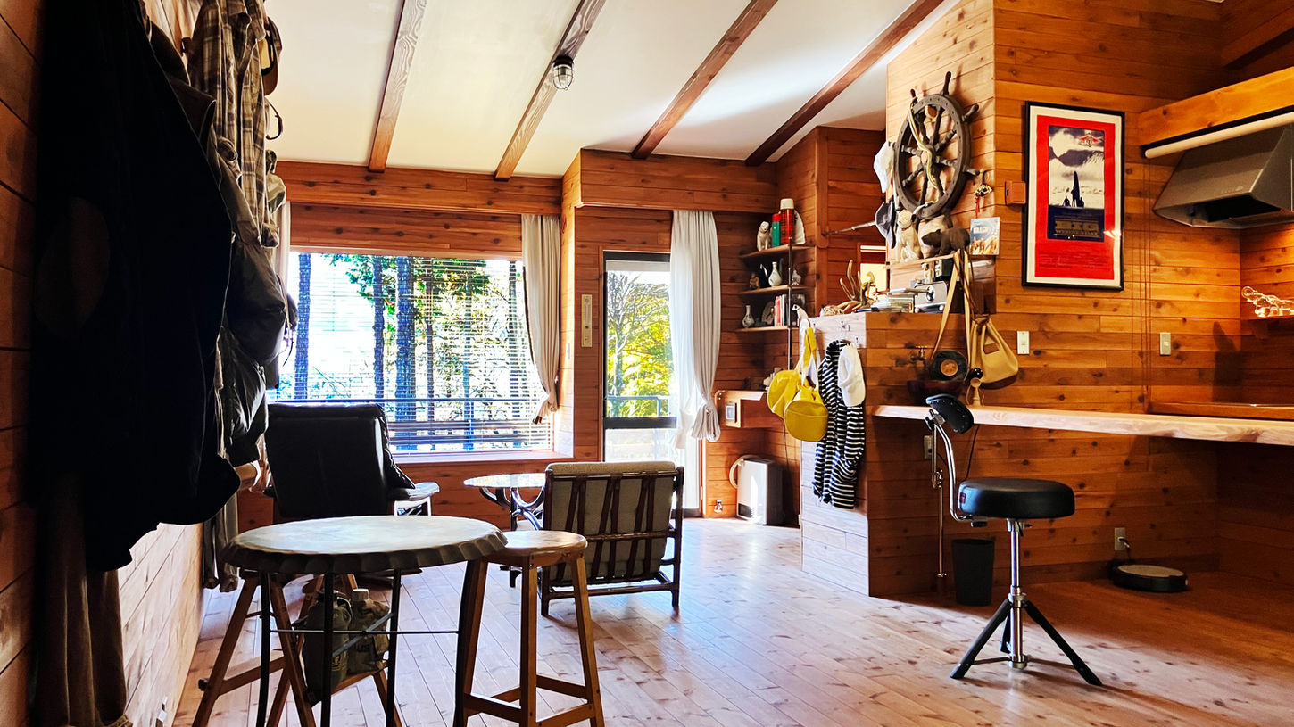 梁・天井・壁・床まで木材を使用し山荘風の雰囲気に仕上がっています。